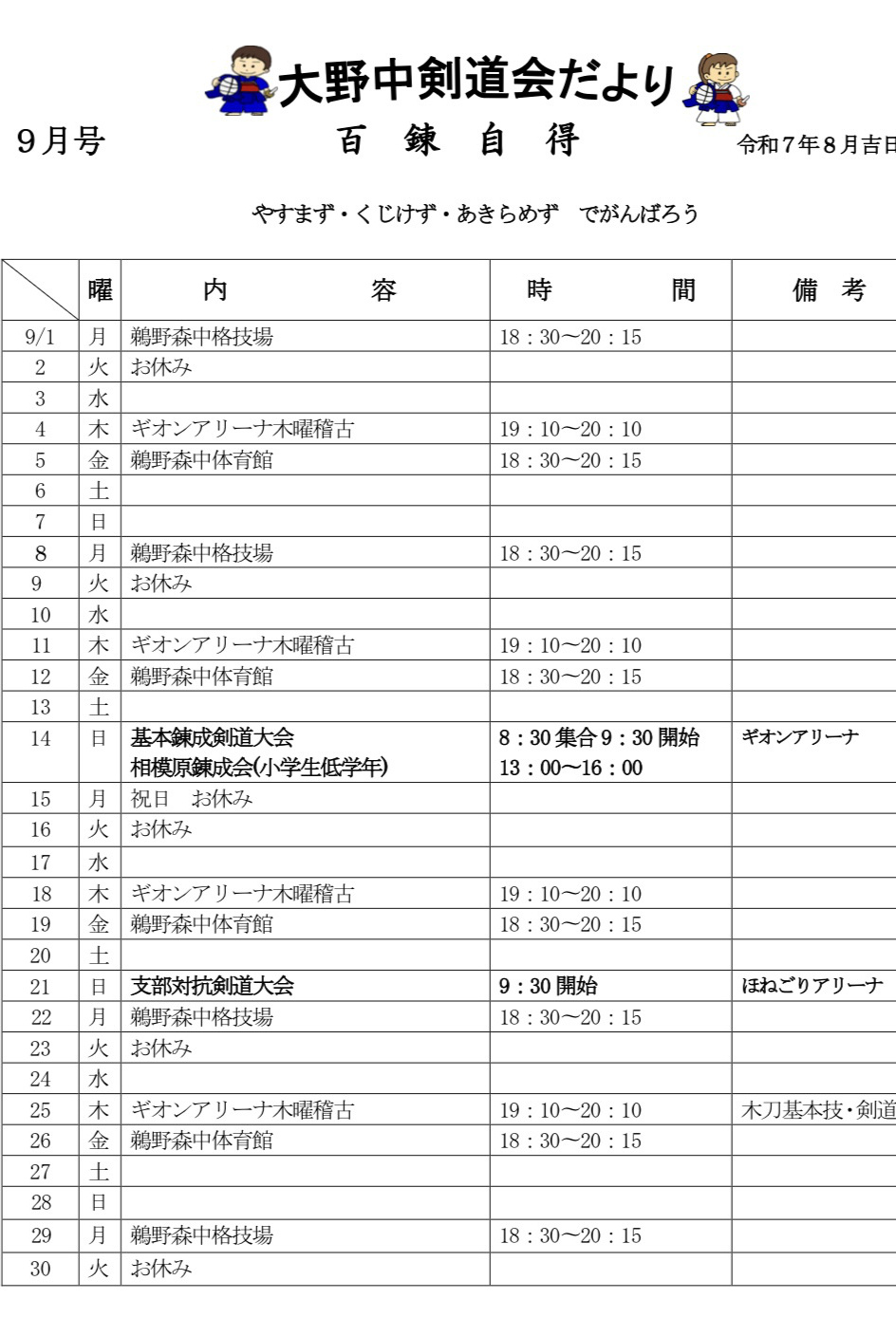 2024/10/29 | 「大野中剣道だより」10月号をアップしました(HPの仕様でタイトル部分が表示されていません)。最新の稽古日程は、インスタグラム「大野中剣道会」のページをご覧ください。 |