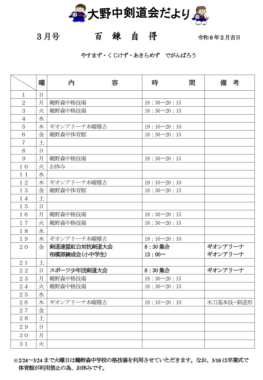 | 2024/10/29 | 「大野中剣道だより」10月号をアップしました(HPの仕様でタイトル部分が表示されていません)。最新の稽古日程は、インスタグラム「大野中剣道会」のページをご覧ください。 |